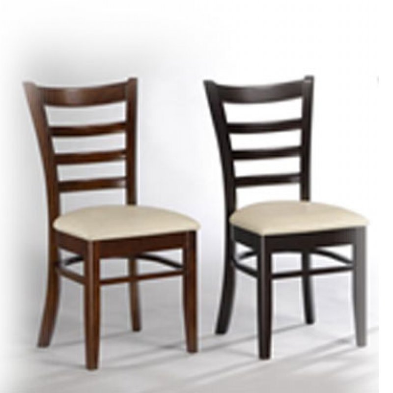 Καρέκλα τραπεζαρίας από μασίφ ξύλο σε χρώμα σκούρο καρυδί με κάθισμα από τεχνόδερμα (PU) σε χρώμα εκρού.