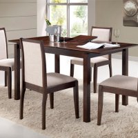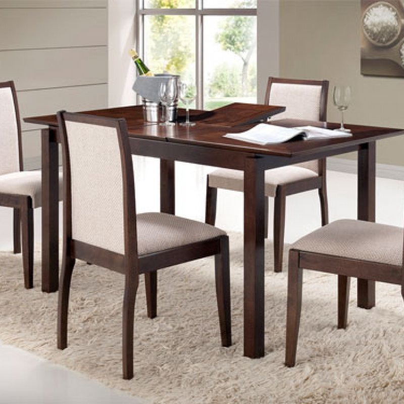 Καρέκλα τραπεζαρίας ξύλινη σε χρώμα σκούρο καρυδί, με υφασμάτινη επένδυση στο κάθισμα και στην πλάτη σε χρώμα εκρού.