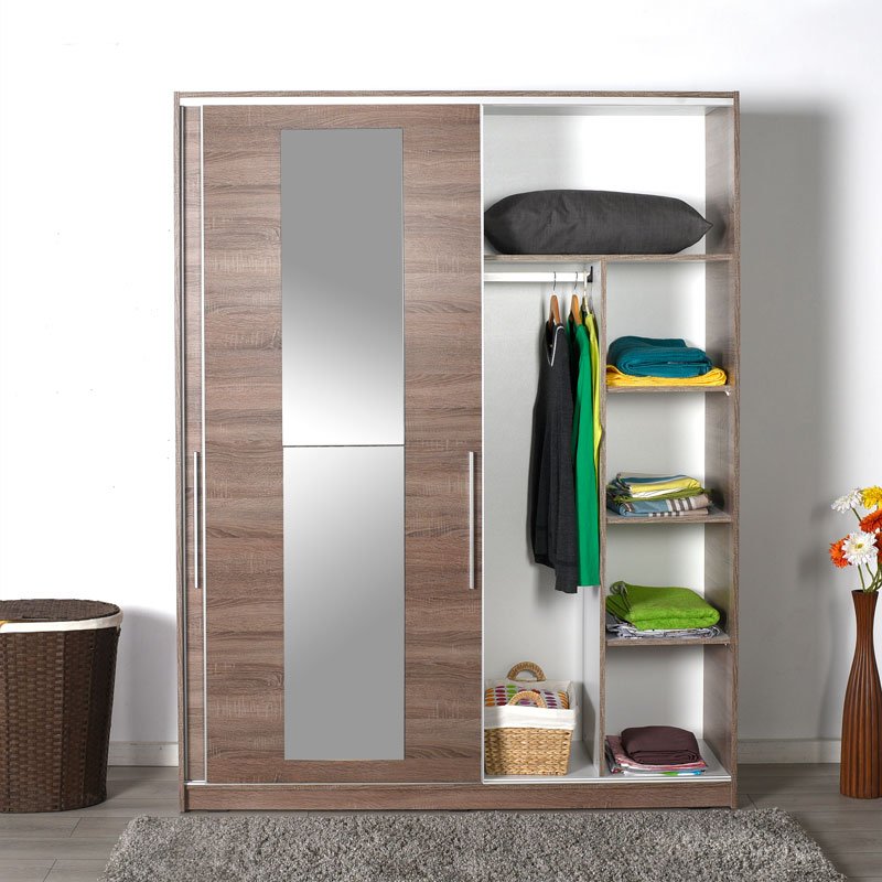 Ντουλάπα δίφυλλη από μελαμίνη υψηλής ποιότητας, σε LATTE χρώμα, με συρόμενες πόρτες και εξωτερικό, δίφυλλο, ορθογώνιο καθρέπτη. Διαθέτει 5 ράφια & ράγα για κρεμάστρες.