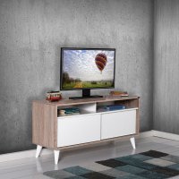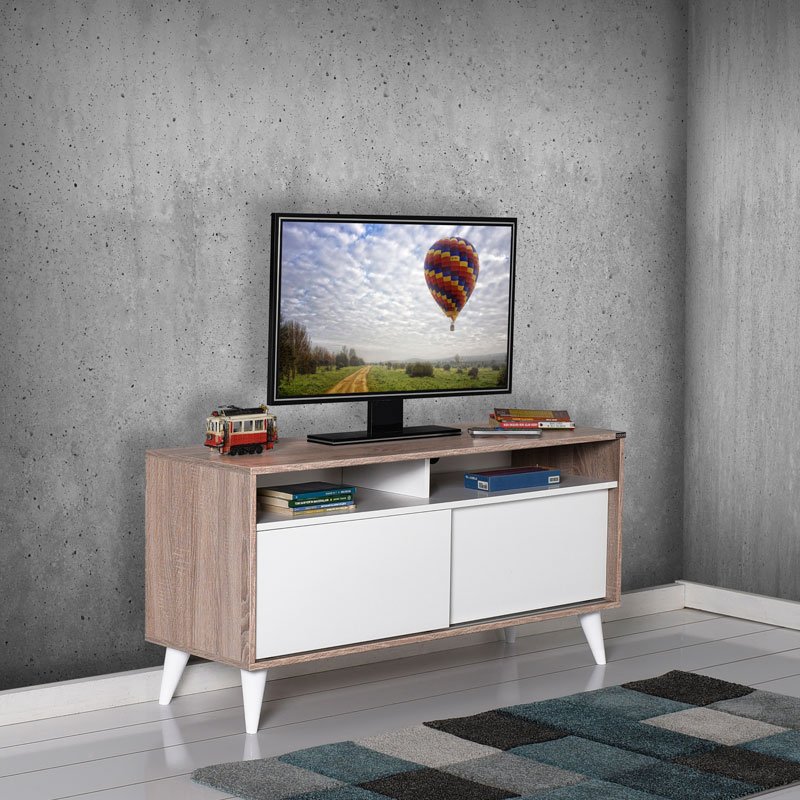 Έπιπλο TV από μελαμίνη υψηλής ποιότητας, με 2 ράφια, 2 συρόμενες πόρτες και ποδαράκια σε ΛΕΥΚΟ (High Gloss) χρώμα και σκελετό σε χρώμα LATTE.